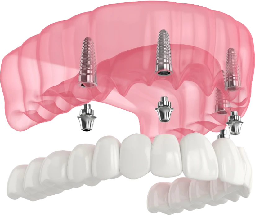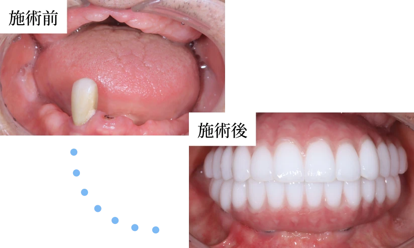 従来、ほとんどの歯を失った方に対するインプラント治療は、骨の移植を伴ったり、8〜14本と多くのインプラントを埋め込む必要がありました。そのため、治療期間や費用、術後の腫れなど患者様への負担が様々な面で大きいというデメリットを抱えていました。